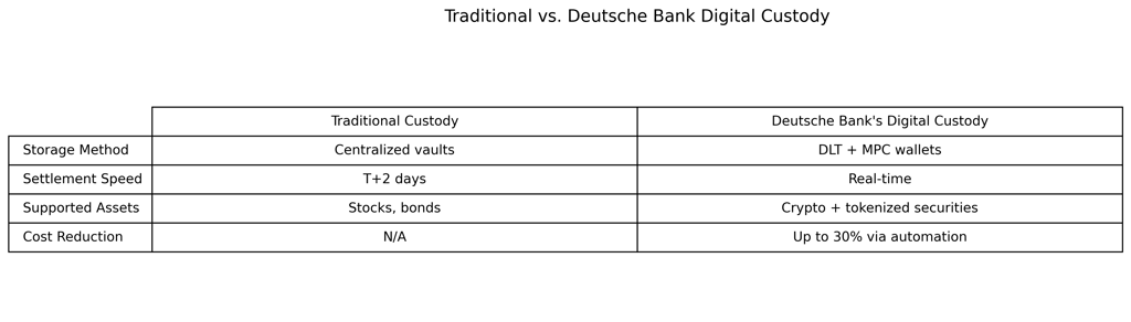 Beyond payments, Deutsche Bank is building digital asset custody services, offering institutional-grade storage for cryptocurrencies akin to traditional securities safekeeping. Launched in 2024 and expanded in 2025, this service supports Bitcoin, Ethereum, and select tokens, with over $10 billion in assets under custody by early 2026. The bank uses multi-party computation (MPC) and air-gapped storage for security, complying with EU MiCA regulations.